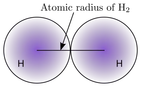 Because it is so difficult to measure atomic size from the nucleus to the outermost edge of the electron cloud, chemists use other approaches to get consistent measurements of atomic sizes. One way that chemists define atomic size is by using the atomic radius. The atomic radius is one-half the distance between the centers of a homonuclear diatomic molecule (a diatomic molecule means a molecule made of exactly two atoms and homonuclear means both atoms are the same element). The figure below represents a visualization of the atomic size definition.