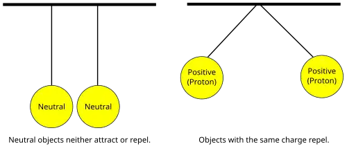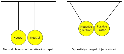 The atom is composed of three different kinds of subatomic particles. First, there are the electrons, which we've already talked about, and which J. J. Thomson discovered. Electrons have a negative charge. As a result they are attracted to positive objects, and repelled from negative objects, which means that they actually repel each other (Figure 4.9).