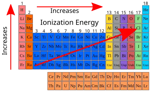 So if we look at the ionization energy trend in the Periodic Table and add it to the trend that exists with atomic size we can show the following on our Periodic Table chart.