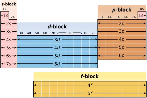 The main group elements are actually in two groups: the s block and the p block. These two, let's call them sub groups, are separated in the Periodic Table by a special group of highly colorful compounds known as the transition metals. The transition metals represent groups 1B through 8B of the diagram below and are formed as electrons are filling in the d orbitals. This is why they are referred to as the d block. We will look at all of this in the lesson that follows.