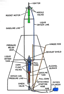 | Figure 23.18: (Left) Robert Goddard launched the first liquid-fueled rocket on March 16, 1926; (Right) This schematic shows details of Goddard's rocket. | |