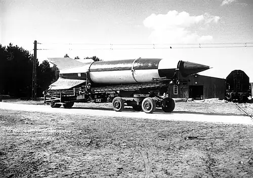 The third great pioneer of rocket science was a Romanian-born German, named Hermann Oberth (1894–1989). In the early 1920s, Oberth came up with many of the same ideas as Tsiolkovsky and Goddard. His early work was not taken seriously by most scientists. Nonetheless, Oberth built a liquid-fueled rocket, which he launched in 1929. Later, he joined a team of scientists that designed the rocket shown in Figure 23.19 for the German military. This rocket, first called the A-4 and later the V-2, played a major role in World War II. The Germans used the V-2 as a missile to bomb numerous targets in Belgium, England, and France. In 1942, the V-2 was launched to an altitude of 176 km (109 miles), making it the first human-made object to travel into space. An altitude of 100 km (62 miles) is generally considered to be the dividing line between Earth's atmosphere and space.