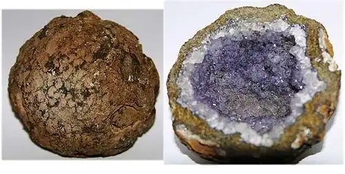 Hot water can hold more dissolved particles than cold water. The hot, salty solution reacts with the rocks around it and picks up more dissolved particles. As it flows through open spaces in rocks, it deposits solid minerals. The mineral deposits that form when a mineral fills cracks in rocks are called veins. Figure 3.24 shows white quartz veins. When the minerals are deposited in open spaces, large crystals can form. These special rocks are called geodes. Figure 3.25 shows a geode that was formed when amethyst crystals grew in an open space in a rock.