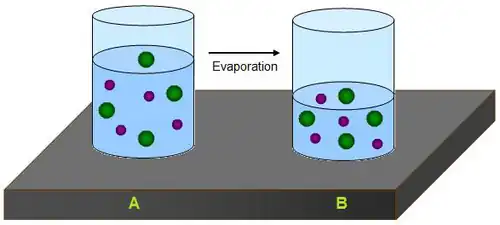 When water evaporates, it leaves behind a solid "precipitate" of minerals, which do not evaporate, as the Figure 3.22 shows. After the water evaporates, the amount of mineral left is the same as was in the water.