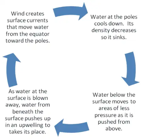 More dense water masses will sink towards the ocean floor. Just like convection in air, when denser water sinks, its space is filled by less dense water moving in. This creates convection currents that move enormous amounts of water in the depths of the ocean. Why is the water temperature cooler in some places? Water cools as it moves from the equator to the poles via surface currents. Cooler water is more dense so it begins to sink. As a result, the surface currents and the deep currents are linked. Wind causes surface currents to transport water around the oceans, while density differences cause deep currents to return that water back around the globe (Figure 14.17).