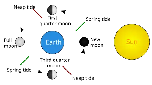 - Neap tides are tides of lower than normal tidal range that occur at first and last quarter moons, when the Moon is at right angles to the Sun.