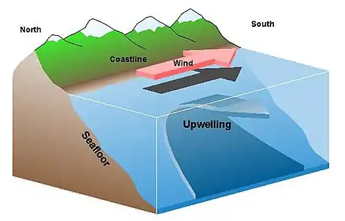 - Cold, nutrient-rich water that rises from oceanic depths usually near the continents, when wind blows the overlying surface away or along the equator.