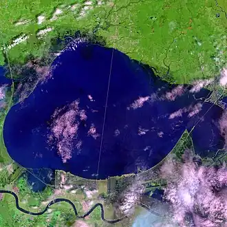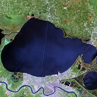 | Figure 23.33: The two images above are from NASA's Landsat 7 satellite. The left shows New Orleans and Lake Pontchartrain on April 26, 2000. The right shows the same area on August 30, 2005, shortly after Hurricane Katrina flooded the city. Dark blue areas in the city are underwater. | |