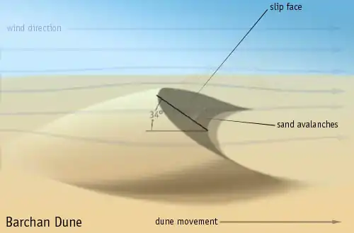- Crescent shaped dune that forms in regions of ample sand, constant winds, and hard ground.