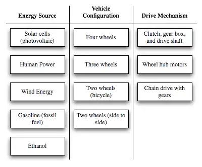 Note that the combination of design elements often does not provide a complete design concept; decisions must be made to fill in the gaps. For example, if solar cells are included as part of a design, they could be placed on the vehicle or they could be part of a fixed charging station that charges a battery on the vehicle; the design team must decide which configuration would make the most sense.
