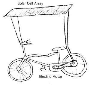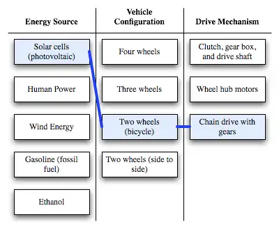 To use the table, a solution for each subproblem is combined, and then a sketch or description of the resulting concept is created. For example, if the concepts are combined as shown in Figure 8, then the possible design in Figure 9 results. This design could be very similar to a standard bicycle with an added solar cell canopy that shades the driver. The pedals of the bicycle would be removed and replaced by an electric motor that drives the vehicle forward.