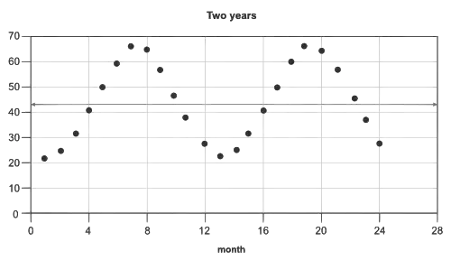 Notice that the data ranges from about 22 to 65. Also notice that the "wave" centers in between these values, around y = 43. Therefore we say that the amplitude of the wave is about 21, which is the distance from the middle to the top or the bottom of the wave.