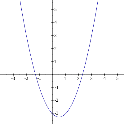 - (c) Vertex: (.5, -3.25); x-intercepts: -1.3, 2.3