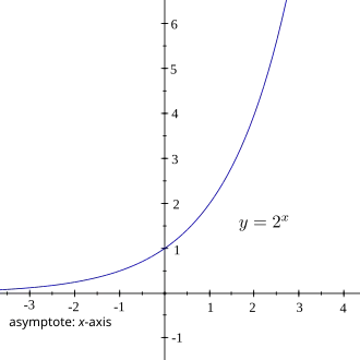 Exponential y = 2x, y = 3x, etc. Exponential functions have a variable as an exponent. The graph has a horizontal asymptote. As x approaches , the function values approach the x−axis (y = 0).