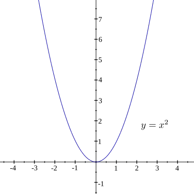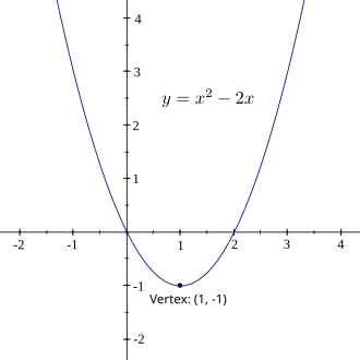 Quadratic y = x2 These functions have a highest exponent of 2. The graph is a parabola, which has a vertex that is either a global maximum or minimum of the graph. The vertex is the point (1, -1). The graph is symmetric across the line x = 1.
