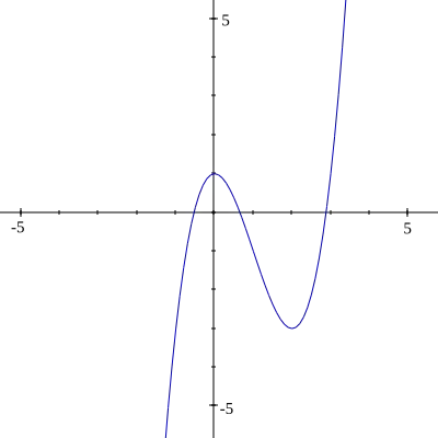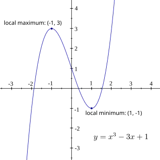 Cubic y = x3 These functions have a highest exponent of 3. The ends of the graph have opposite behavior. Cubic graphs either have a local maximum and minimum, like the one in the graph to the right, or no local maximums or minimums, like y = x3.