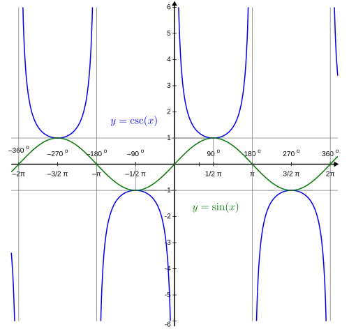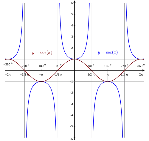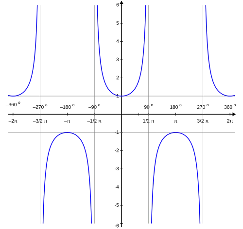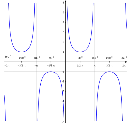 The period of the function is therefore 2π with a domain of all real angles except multiples of π {… −2π, −π, 0, π, 2π …}. The range is all real numbers greater than 1 or less than −1.