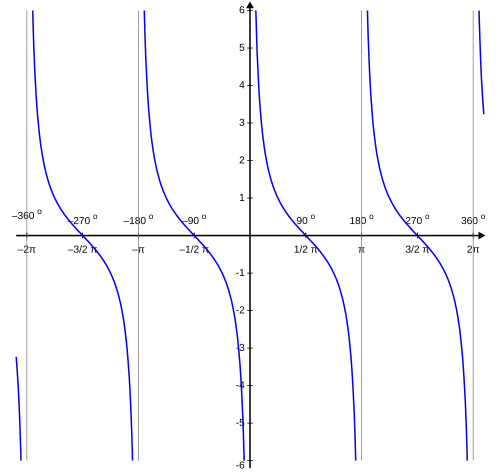 Notice that the x axis is measured in radians (not in terms of π). Our asymptotes occur every π radians, starting at . The period of the graph is therefore π radians. The domain is all reals except for the "holes" at , , −, etc. and the range is all real numbers.