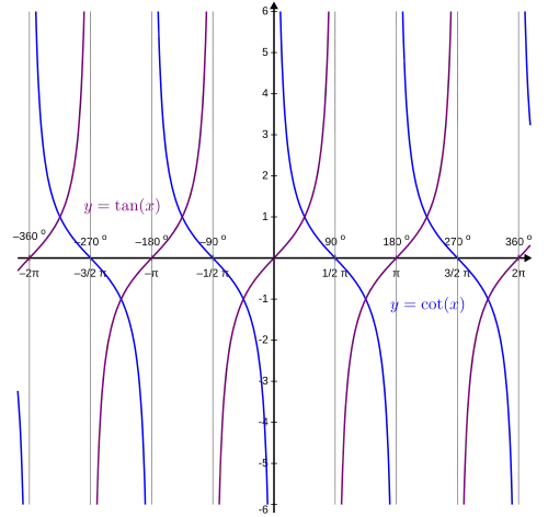 The cotangent function has a domain of all real angles except multiples of π {… − 2π. − π.0, π, 2π …} The range is all real numbers.