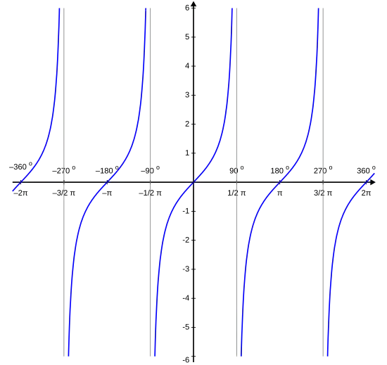 The graph of the tangent ratio as a function of the angle of rotation presents a few complications. First of all, the domain is no longer all real angles. As you may remember there are some angles (90° and 270°, for example) for which the tangent is not defined. As we will see in this section, the range of tan(x) is actually all real numbers.