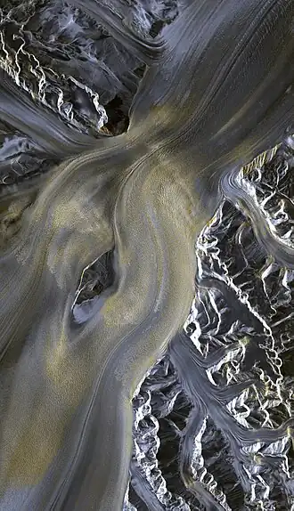 Beyond the ablation zone, where the glacier melts, the water from it will be carried away, typically in a braided stream (a term which will be explained in more depth in the article on rivers). This will carry with it the lighter sediments, known as outwash, which will be deposited in front of the glacier as an outwash plain.