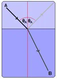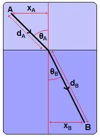 Using the principle of least time, we can say exactly how refraction should take place: a little simple mathematics tells us that the ratio of the velocity in medium A to the velocity in medium B should be equal to the ratio of sin θA to sin θB; or to put it another way, equal to the ratio of xA/dA to xB/dB. This is known as Snell's Law. Where the velocity changes smoothly and gradually through the medium, this will result in the ray taking a curved path.