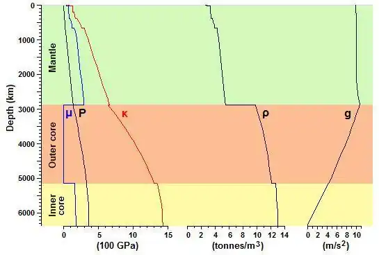 These constraints are sufficient for geologists to work out figures for pressure, density, gravity, incompressibility, and so forth. Some results are shown in the graphs to the right.