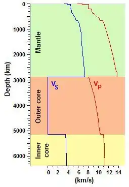 Finally, the core. The differentiation of the core into an outer liquid core and an inner solid core is based on the study of S- and P-waves. S-waves don't travel through the outer core, proving that it is liquid; P-waves travel faster through the inner core, showing an abrupt transition that corresponds well to a change of phase from liquid to solid.