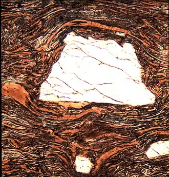 This appearance is even more evident under the microscope. The photograph to the right shows a photomicrograph of welded tuff, where the clasts have been squashed and welded together (the larger, white fragments are broken crystals included in the ash). Note the distinctive shape of the clasts: no-one looking at welded tuff under a microscope could mistake it for anything but welded tuff.
