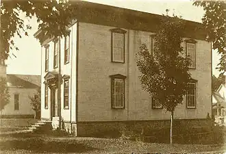 In 1898, this building was moved to South Street to make room for the new building. While on South Street, it was used as a Town Hall, Fire Department, Gas Station, Apartment on the second floor, and a Second Hand Store. It was torn down in the 1980's. — Echoes of the Past
