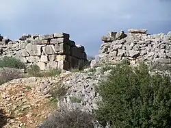 In contrast to the Minoans, the Mycenaean leaders built fortresses — enormous walled structures that contained a megaron like the Minoan palace, but were primarily fortifications for defense. The walls of these structures often stood forty or fifty feet high, and were composed of enormous blocks of stone weighing two to three tons, fitted together without mortar. Fortresses at Tiryns and at Mycenae are considered the best examples of these military structures.