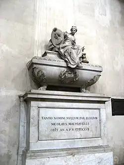 Machiavelli died in 1527 at 58 after receiving his last rites.[17] He was buried at the Church of Santa Croce in Florence. An epitaph honouring him is inscribed on his monument. The Latin legend reads: TANTO NOMINI NULLUM PAR ELOGIUM ("So great a name (has) no adequate praise" or "No eulogy (would be) a match for such a great name").