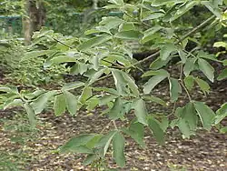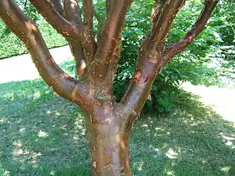 It is a small to medium-sized deciduous tree, reaching 10-18 m tall, and has smooth, shiny orange-red bark, which peels in thin, papery layers (mature bark is platy and brightly metallic-copper in color). The leaves are compound, with three leaflets, each 4-10 cm long and 2-6 cm broad, dark green above, bright glaucous blue-green beneath. The petioles and young stems are pubescent. The flowers are produced in small corymbs in spring, the fruit being a pair of winged samaras with the seeds about 1 cm long and a 3 cm wing. Young trees are upright, eventually developing a rounded habit.