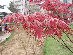 Japanese Maple has been grown in temperate areas around the world since the 19th century and has been cultivated in Japan for centuries.[3] In Japan it is used as an accent tree in Japanese gardens, providing gentle shade next to the house in the summer and beautiful colors in fall. Numerous cultivars are readily available commercially and are a popular item at garden centres and other retail stores in Europe and North America. Red-leafed cultivars are the most popular, followed by cascading green shrubs with deeply dissected leaves.[3] It is also a popular and appropriate choice for bonsai enthusiasts and has been used in this art throughout its history.