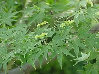 It is a deciduous shrub or small tree reaching heights of 6–10 m, rarely 16 m, often growing as an understory plant in shady woodlands. It may have multiple trunks joining close to the ground. In habit, it is often shaped like an upside-down pyramid (especially when younger) or takes on a dome-like form, especially when mature.[3] The leaves are 4–12 cm long and wide, palmately lobed with five, seven, or nine acutely pointed lobes. The flowers are produced in small cymes, the individual flowers with five red or purple sepals and five whitish petals. The fruit is a pair of winged samaras, each samara 2–3 cm long with a 6–8 mm seed. The seeds of Japanese maple and similar species require stratification in order to germinate.[3][4]