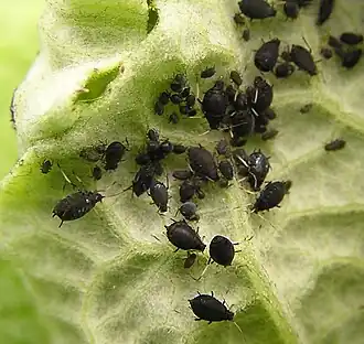 The Bean Aphid is most notable as an agricultural pest of beans, but also feeds on a wide variety of garden plants, both woody and herbaceous.
