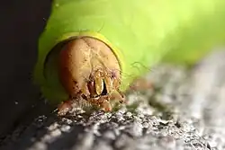 Both caterpillars and sawfly larvae have soft bodies that can grow rapidly between molts, like a balloon. Only the head capsule is hardened. In caterpillars, the mandibles are tough and sharp for chewing leaves; in most adult Lepidoptera mandibles are highly reduced or soft. Behind the mandibles are the spinnerets, for manipulating silk. Another distinctive characteristic of the caterpillar is the upside down Y on the front of the head (Scoble, 1995).