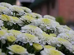 Modern chrysanthemums are much more showy than their wild relatives. The flowers occur in various forms, and can be daisy-like, decorative, pompons or buttons. This genus contains many hybrids and thousands of cultivars developed for horticultural purposes. In addition to the traditional yellow, other colours are available, such as white, purple, and red. The most important hybrid is Chrysanthemum × morifolium (syn. C. × grandiflorum), derived primarily from C. indicum but also involving other species.