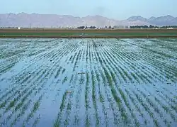 Irrigation is the artificial application of water to the soil in order ensure an adequate supply of water for plants. In crop production it is mainly used to replace missing rainfall in periods of drought, but also to protect plants against frost.[1] Additionally irrigation helps to suppress weed growing in rice fields.[2]