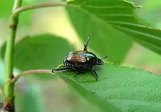 The Japanese beetle (Popillia japonica) is a beetle about 1.5 cm (0.6 inches) long and 1 cm (0.4 inches) wide, with shiny copper-colored elytra and a shiny green top of the thorax and head. It is not very destructive in Japan, where it is controlled by natural enemies, but in America it is a serious pest to rose bushes, grapes, crape myrtles, and other plants. It is a weak flyer and drops several centimeters when it hits a wall.