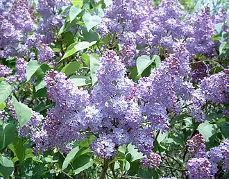 Common Lilac is a very common ornamental plant in gardens and parks, because of the attractive, sweet smell of its flowers. Most garden plants are cultivars with flowers varying from white to dark lilac; some have double flowers with the stamens replaced by extra petals. The cultivar 'Aurea' has yellowish foliage. The majority of garden cultivars do not exceed 4-5 m tall.[4] It is widely naturalised in western and northern Europe.[5]