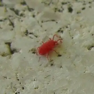 Tetranychus urticae (an animal with over 60 common names, including red spider mite and two-spotted spider mite) is one of many species of plant-feeding mites found in dry environments, and generally considered a pest. It is the most widely known member of the family Tetranychidae or Spider mites.