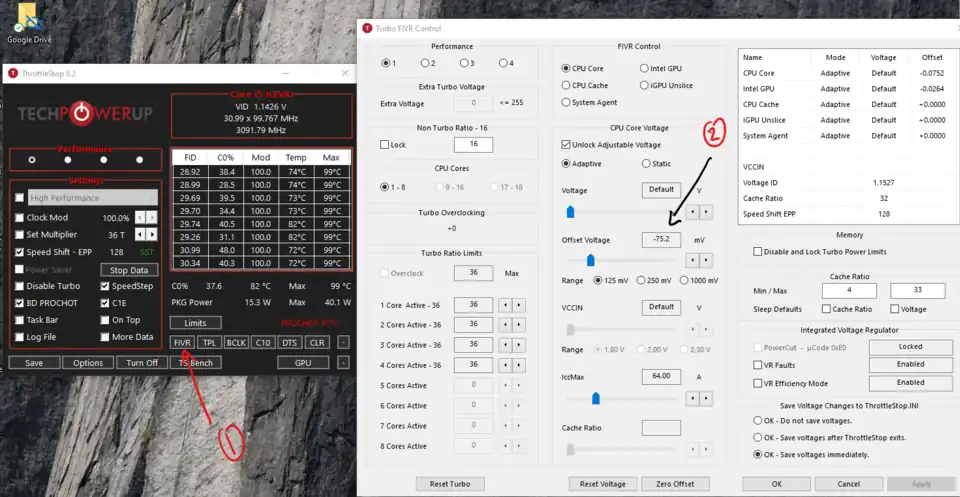 The above screenshot shows the process of undervolting in ThrottleStop - click (1) and adjust (2). -50 mV to -100 mV is around the tolerance range of most laptops.
