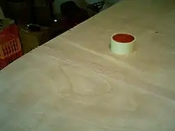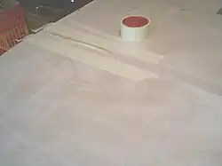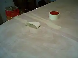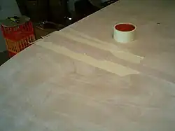However, for our simple teardrop trailer we will create a moulding over the seam with Bondo. Step one is to apply masking tape on either side of the seam. Once that is done, mix some bondo according to the directions and apply a thick layer (about 1/8" thick) across the seam and over the edges of the masking tape.