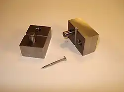 The axle press is an anvil split in two with a hole for the axle and an indentation for the axle head. A hammer is used to tap the head into the indentation and forge the angle in the head. The press has a flat side and an indented side. To straighten the axle, first make a mark on the nail head. Insert the axle into the flat side of the press with the mark at the 12 o'clock position. Place the axle press on its side and strike it several times with a hammer, then rotate to the 4 o'clock position. Hammer, rotate to the 8 o'clock position, then hammer again.