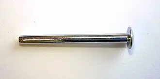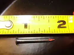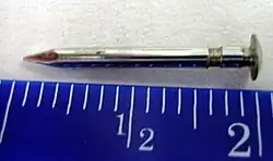 Pinewood derby axles are one inch long, 0.087 inch diameter zinc plated steel nails. The minimal axle treatment is the removal of the burrs and crimp marks with a file, followed by sanding and polishing. When it is allowed by the rules, the axle shaft can be cut with grooved and the head tapered. The grooves reduce the contact area between the axle and wheel hub bore and tapering reduces the contact area between the axle head and the outer hub.