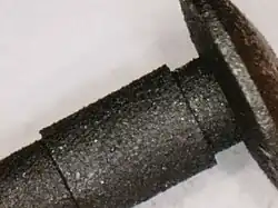 Use wet/dry sandpaper starting with CAMI 400 grit (30 micron = 30 μm = 0.03 mm). Cut the sandpaper into 1/4" strips that are several inches long. Dip the paper in water and sand the exposed portion of the axle for approximately 30 seconds with the axle rotating at high speed. Don't forget to polish under the axle head. Folding the sandpaper in half can help here. Proceed to 600, 1200, and 1500 grit sandpapers. Cushioned abrasives are available down to 3 micron grit.[2] Diamond paste polishes are available from 45 μm down to 0.1 μm.[3]