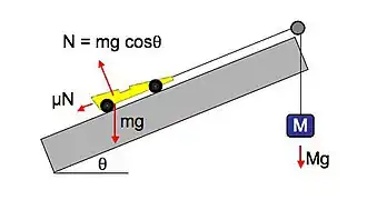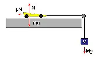 The static and dynamic friction can be measured using the apparatus in Figure 1.[3] From Newton's Second Law of Motion we know that the forces balance, therefore the normal force balances the gravitational force on the car
