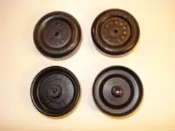 Pinewood derby wheels are made by an injection molding process that leaves undesirable blemishes and imperfections in the parts. Since the wheels are the only moving parts, their quality has a significant effect on performance. Stock wheels are 1.190 inch diameter and 0.415 inch wide with a 0.310 wide tread contact area. This chapter covers selecting wheels, sanding, shaving or lathing the tread, coning the hubs, polishing the bores, balancing and, as a final touch, highlighting the spokes and raised letters. As always, know the rules of your organization before starting your work.