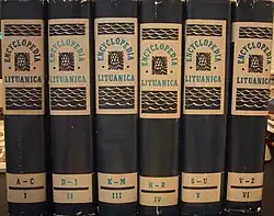 Today thousands of specialist encyclopedias are in print (Figure 2.2, “The six-volume Encyclopedia Lituanica, published from 1970 to 1980 in Boston, Massachusetts” shows one of these, the Encyclopedia Lituanica, an English-language six-volume encyclopedia on Lithuania). General encyclopedias have become household names: Encyclopaedia Britannica[3] and World Book for English speakers, the German Brockhaus, and the French Larousse. The Great Soviet Encyclopedia grew to 100,000 articles in Russian and produced encyclopedias in other languages of the USSR.